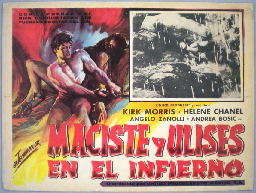 Beautiful Mexican jumbo lobby card (12.25x16.25") from the 1962 Italian / Medallion adventure / fantasy / sword & sandal / beefcake film, THE WITCH'S CURSE, which starred Kirk Morris, Helene Chanel, Vira Silenti, Andrea Bosic and Remo De Angelis. $15 each |