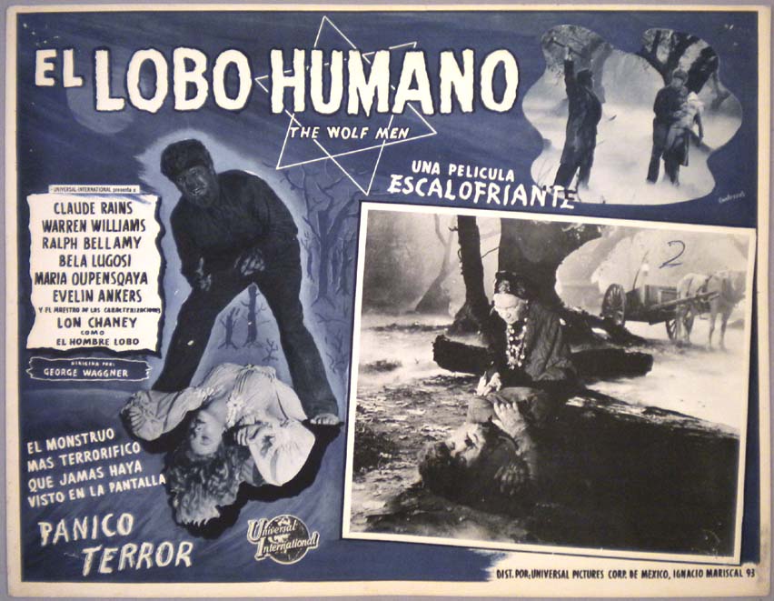 Beautiful Mexican jumbo lobby card (12.25x16.5") from the 1941 Universal horror / monster film, THE WOLF MAN, which starred Lon Chaney Jr., Claude Rains, Warren William, Ralph Bellamy, Patric Knowles, Bela Lugosi, Maria Ouspenskaya and Evelyn Ankers. This rare card is likely from the 1950s reissue of the film. There is a inked '2' handwritten on the background portion of the inset scene -- but this flaw does not detract from the main art work. Otherwise, the card is in great shape. $150 |