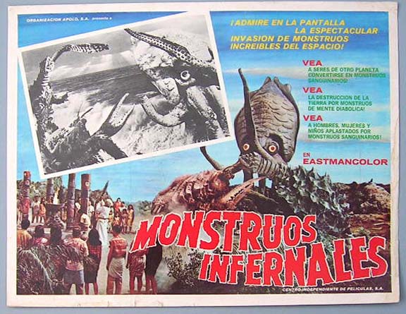 Beautiful Mexican jumbo lobby card (12.5x16.5") from the 1971 Toho / AIP Japanese monster / sci-fi film, YOG - THE MONSTER FROM SPACE, which starred Akira Kubo, Atsuko Takahashi, Yukiko Kobayashi, Kenji Sahara and Yoshio Tsuchiya. The film was directed by Ishiro Honda. The original Japanese title of the film was, Gezora-Ganime-Kameba: Kessen! Nankai no daikaiju. $25 each |
