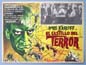 Beautiful Mexican jumbo lobby card (12.5x16.5") from the 1963 AIP Gothic horror film, THE TERROR, which starred Boris Karloff, Jack Nicholson, Sandra Knight, Dick Miller and Jonathan Haze. The film was directed by Roger Corman. Although the border art and film info is all for 'The Terror,' the inset-scenes are all from the Val Lewton horror movie, 'Bedlam.' $20 each |