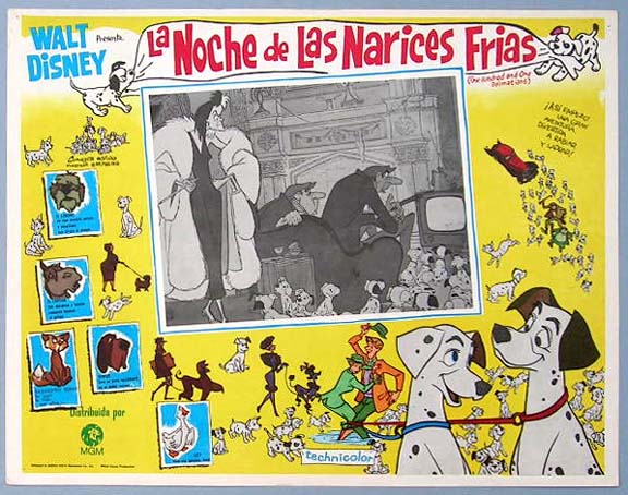 Beautiful Mexican jumbo lobby card (12.5x16.5") from the 1961 Disney animated film, 101 Dalmations, which featured the voices of Rod Taylor, J. Pat O'Malley, Betty Lou Gerson and Martha Wentworth. $25 each |