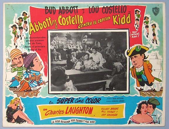 Beautiful Mexican jumbo lobby card (12.5x16.5") from the 1952 Universal comedy / swashbuckler film, ABBOTT AND COSTELLO MEET CAPTAIN KIDD, which starred Bud Abbott, Lou Costello, Charles Laughton, Hillary Brooke and Fran Warren. $20 each |