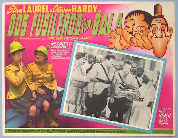 Beautiful Mexican jumbo lobby card (12.5x16.5") from the 1935 Hal Roach comedy film, BONNIE SCOTLAND, which starred Stan Laurel, Oliver Hardy, June Lang, William Janney, Anne Grey, Vernon Steele and James Finlayson. $25 each |