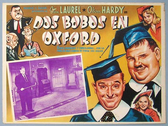 Beautiful Mexican jumbo lobby card (12.5x16.5") from the 1940 Hal Roach / United Artists comedy film, A CHUMP AT OXFORD, which starred Stan Laurel, Oliver Hardy, Wilfred Lucas, Forbes Murray and Frank Baker. $35 each |