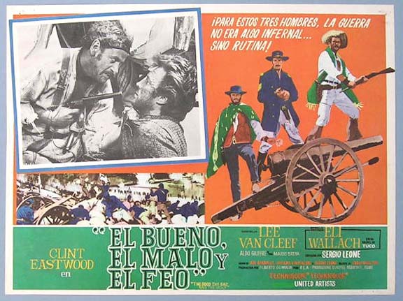 Beautiful Mexican jumbo lobby card (12.5x16.5") from the 1966 United Artists / Italian Spaghetti western film, THE GOOD, THE BAD AND THE UGLY, which starred Clint Eastwood, Eli Wallach, Lee Van Cleef, Aldo Giuffre, Luigi Pistilli and Rada Rassimov. The film was directed by Sergio Leon, with music by Ennio Morricone. $55 each |