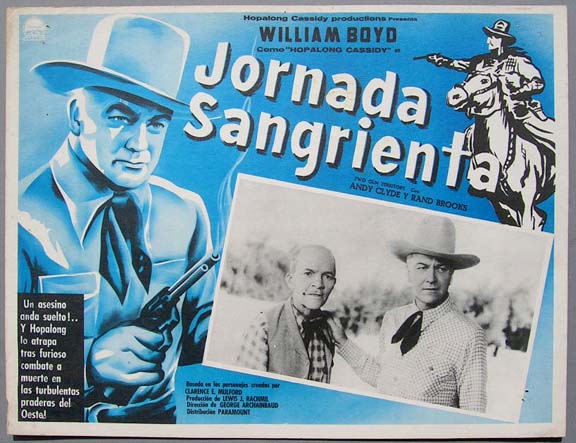 Beautiful Mexican jumbo lobby card (12.5x16.5") from an unidentified Hopalong Cassidy film, probably produced in the 1940s. The Mexican title of the film was, Jornada Sangrienta. If anyone can help us identify this movie, we'd certainly appreciate hearing from you. $20 each |