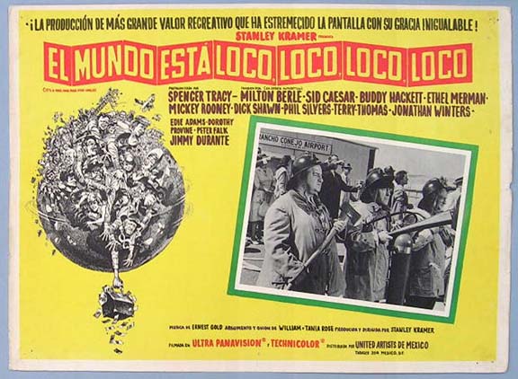 Beautiful Mexican jumbo lobby card (12.5x16.5") from the 1963 Cinerama all-star comedy film, IT'S A MAD, MAD, MAD, MAD WORLD, which starred Spencer Tracy, Edie Adams, Milton Berle, Sid Caesar, Buddy Hackett, Ethel Merman and Mickey Rooney. The film was directed by Stanley Kramer. The scene pictures the Three Stooges -- Joe DeRita, Larry Fine, Moe Howard -- as firemen. $45 |