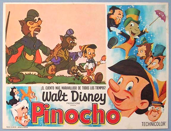 Beautiful Mexican jumbo lobby card (12.5x16.5") from the 1940 Walt Disney animated film, PINOCCHIO, which features the voices of Mel Blanc, Don Brodie, Walter Catlett, Frankie Darro and Cliff Edwards. $20 each |