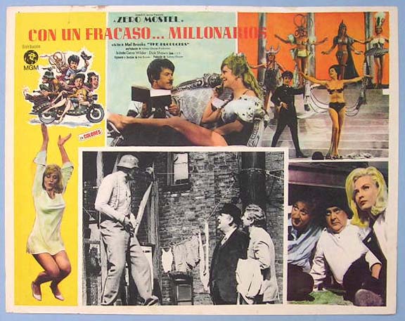 Beautiful Mexican jumbo lobby card (12.5x16.5") from the 1967 Embassy Pictures comedy film, THE PRODUCERS, which starred Zero Mostel, Gene Wilder, Kenneth Mars and Estelle Winwood. The film was directed by Mel Brooks. $25 each |
