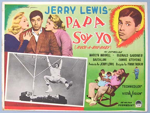 Beautiful Mexican jumbo lobby card (12.5x16.5") from the 1958 Paramount comedy film, ROCK-A-BYE BABY, which starred Jerry Lewis, Marilyn Maxwell, Connie Stevens, Salvatore Baccaloni, Reginald Gardiner and Hans Conried. $15 each |