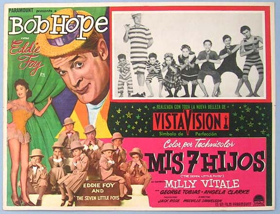 Beautiful Mexican jumbo lobby card (12.5x16.5") from the 1955 Paramount comedy / drama / biographical film, THE SEVEN LITTLE FOYS, which starred Bob Hope, Milly Vitale, George Tobias, Angela Clarke and Herbert Heyes. $15 each |
