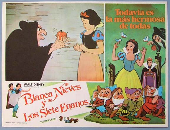 Beautiful Mexican jumbo lobby card (12.5x16.5") from the 1937 Walt Disney animated film, SNOW WHITE AND THE SEVEN DWARFS, which features the voices of Adriana Caselotti, Lucille La Verne, Harry Stockwell, Eddie Collins and Billy Gilbert. $20 each |
