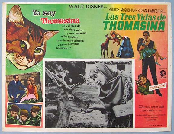 Beautiful Mexican jumbo lobby card (12.5x16.5") from the 1964 Disney family film, THE THREE LIVES OF THOMASINA, which starred Patrick McGoohan, Susan Hampshire, Laurence Naismith, Jean Anderson and Wilfrid Brambell. $20 each |