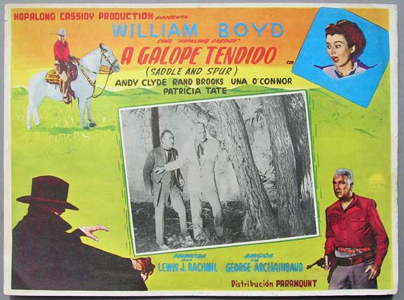 Beautiful Mexican jumbo lobby card (12.5x16.5") from the 1947 United Artists western film, UNEXPECTED GUEST, which starred William Boyd, Andy Clyde, Rand Brooks, Una O'Connor and John Parrish. This movie was part of the Hopalong Cassidy film series. $20 each |
