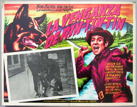 Beautiful Mexican jumbo lobby card (12.5x16.5") from the 1936 Reliable western / canine / adventure film, THE VENGEANCE OF RANNAH, which starred Rin Tin Tin Jr., Bob Custer, John Elliott, Victoria Vinton and Roger Williams. $25 each |