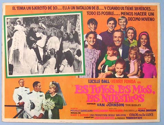 Beautiful Mexican jumbo lobby card (12.5x16.5") from the 1968 United Artists comedy / family film, YOURS, MINE AND OURS, which starred Lucille Ball, Henry Fonda, Van Johnson, Louise Troy and Tim Matheson. $20 each |