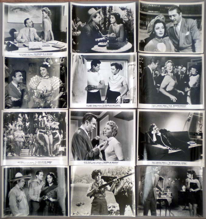Group lot of 12 original B&W Mexican movie photos / stills, from various Mexican films. The stills measure between 7x9 and 8x10 inches. Included in this lot are photos picturing the following stars: Silvia Pinal, Rosa Carmina, Maria Antonieta Pons, Elsa Aguirre, Marga Lopez, Lilia del Valle, and others. These are used stills and most have signs of wear/handling, including: some trimmed borders, edge wear, creases, and a few tears. Still, the group is in pretty nice condition and they will display very well. $30 (for 12 Photos) |