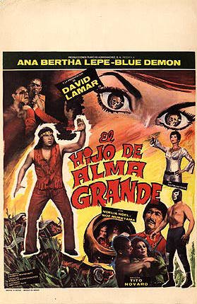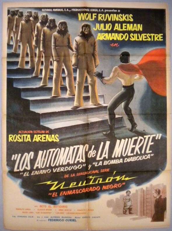 Rare horror film poster has excellent, atmospheric graphics and a great image of the monster ! This classic Frankenstein / masked wrestler / lucha libre film is one of the greats -- voted by Mexican critics as one of the two best Mexican horror films ever produced. This poster has some edge wear and heavy damage/wear at center fold line, but if linen-backed, it would be fairly easy to restore... This movie starred Columbia Dominguez, Crox Alvarado, Wolf Ruvinskis and Carlos Riquelme. $30 |