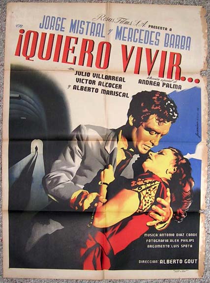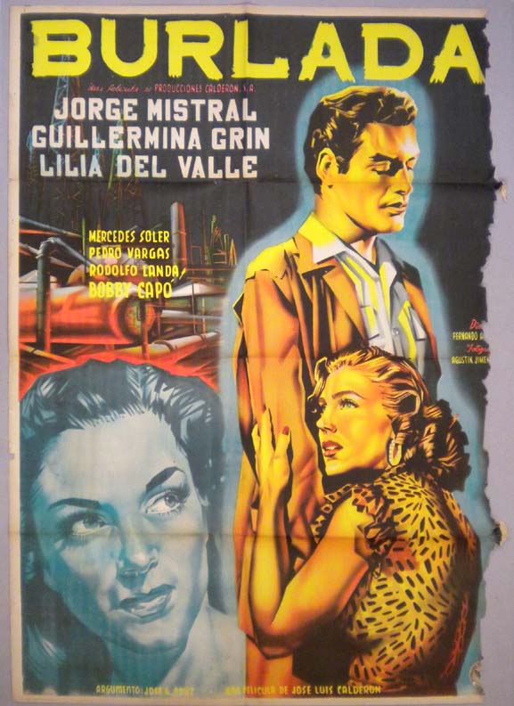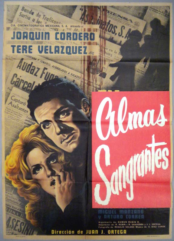 Wonderful film-noirish film poster with a striking design ... Armengod holding a dying Grin in his hands. There were several holes in the poster which someone has repaired poorly using masking tape on the back. Still, these flaws are not to distracting, and the poster will display well... This movie starred Ramon Armengod, Guillermina Grin, Tito Junco, Roberto Soto and Pedro Vargas. $40 |