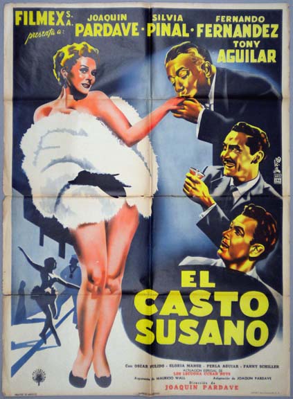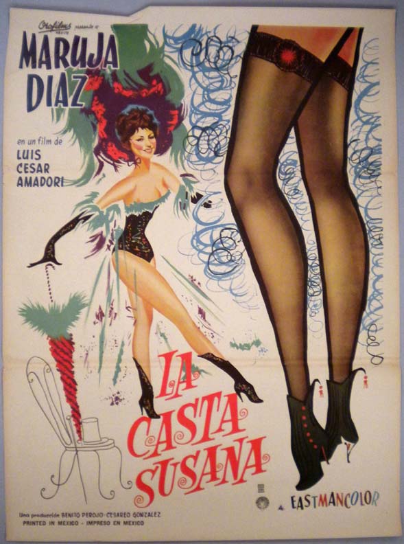 Gorgeous comedy film poster has a delicate style and lovely graphics. There are colorful portraits of three of the stars, but check out those showgirl legs!!! This is a used poster that has some signs of handling-- extra fold lines, edge wear, small tears, pinholes and surface dings -- but the flaws are not very distracting and it will display quite well... This movie starred Pepe Iglesias 'El Zorro,' Alma Rosa Aguirre, Fernando 'Mantequilla' Soto and Julio Villarreal. $40 |