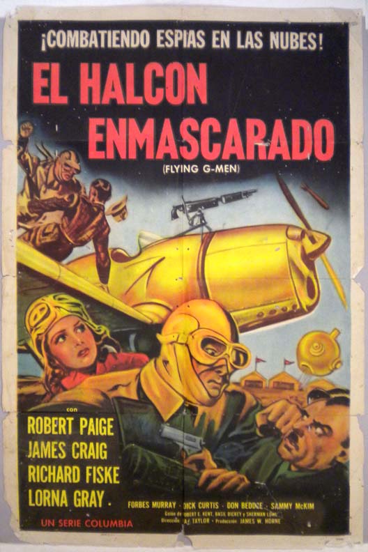 Colorful movie poster for the Spanish-language release of a 1939 American serial. Great graphics picture a masked aviator battling a Hitler look-alike! The 27x41" poster has heavy signs of use, including: numerous bug holes, edge wear, tears, fold separation and general surface marks/dings. However, the colors are still bright and it will display OK. The serial was released in the USA as, Flying G-Men... This film starred Robert Paige, Richard Fiske, James Craig and Lorna Gray. $30 |