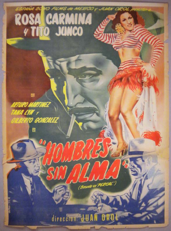 Superb Mexican crime movie poster showcases standard film noir trappings -- some tough looking thugs and a sexy femme fatale! The are quite a few chips and tears along the borders, plus several tears within the printed area which has been repaired using paper from another vintage poster. These flaws are not very distracting, and they not greatly affect the lovely image area. The poster will display beautifully ... The film starred Rosa Carmina, Tito Junco, Arturo Martinez, Tana Lynn and Gilberto Gonzalez. (Rolled) $50 |