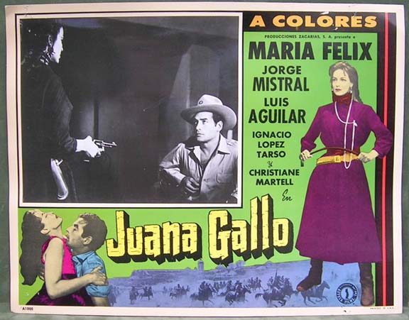 Beautiful historical / revolutionary film lobby card features a wonderful image of a whip-wielding Maria Felix on the color art. The B&W photo-scene has a scene from the film. The card has a number of pinholes -- mainly near the corner, plus a few other small scuffs/dings. However, these flaws are not too distracting, and otherwise, the colors are bright and the card will display well... This movie also starred Jorge Mistral, Luis Aguilar, Christiane Martell, Rita Macedo, Rene Cardona and Sonia Infante. $10 each |