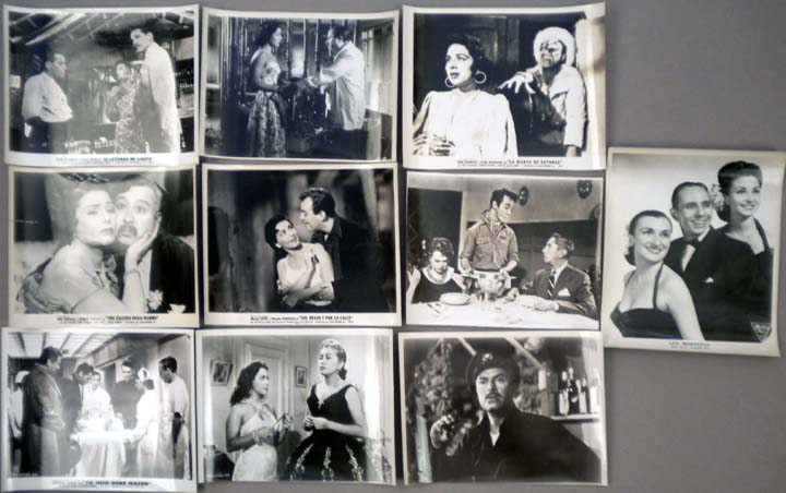 Group lot of 10 original B&W Mexican movie photos / stills, from various Mexican films. The stills measure between 7x9 and 8x10 inches. Included in this lot are photos picturing the following stars: Flor Silvestre, Lola Beltran, Agustin Lara, Joaquin Pardave, Pedro Armendariz, Elsa Aguirre, Marga Lopez, Arturo de Cordova, Los Monteros dancing act, and others. These are used stills and most have signs of wear/handling, including: some trimmed borders, edge wear, creases, and a few tears. Still, the group is in pretty nice condition and they will display very well. $20 (for 10 Photos) |