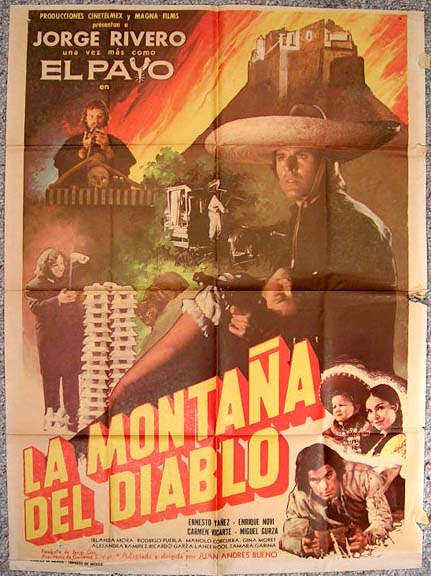 Colorful western film poster with a great close-up of a masked cowboys, surrounded by a montage of scenes from the film. The poster has heavy signs of use, including: extensive separations along the fold lines, edge wear, tears, border chips, and general surface marks/dings. However, the colors are still bright and if matted and framed, it will display pretty well... This movie starred Elsa Cardenas, Alvaro Zermeno, Andres Soler and Jorge Russek. $20 |