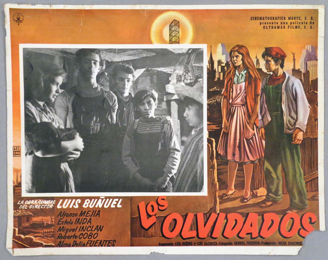 Attractive window card poster (15x16") from what is considered one of the classic Mexican films, directed by Luis Bunuel. The art work is the same as on the rare and desirable onesheet poster. The card shows two youths on the streets of a city slum. The color and graphics quite striking! There are several tears along the top border, some edge wear, and a piece missing at the lower right corner. On the other hand the colors are bright, and if matter and framed, the card will display very well... This movie starred Stella Inda, Miguel Inclan, Alfonso Mejia, Roberto Cobo and Alma Delia Fuentes. $30 |