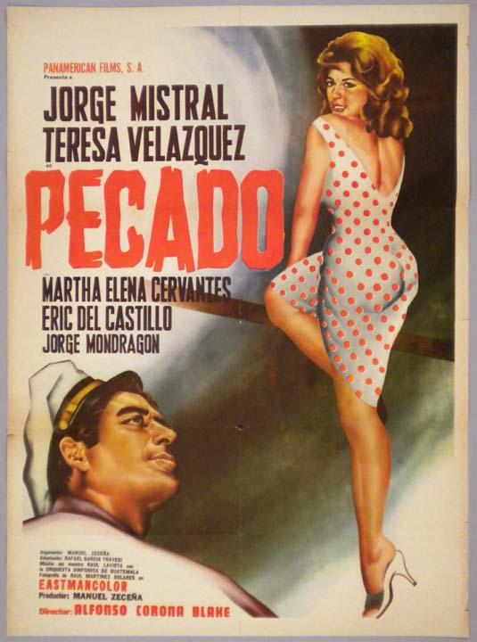 Beautiful crime film poster presents a very sexy main image -- featuring the ultimate femme fatale! The art work shows off some of the best attributes of the shapely Ms. Velazquez. WOW!!! This is a used poster with some wear and separation along the fold lines and a small repaired hole in the dark green background area, but these flaws are not very distracting. The onesheet will still display very well... The film starred Jorge Mistral, Teresa Velazquez, Marta Elena Cervantes, Eric del Castillo and Jorge Mondragon. (This poster has only limited, very mild fold lines -- so it will be sent rolled.) $40 |