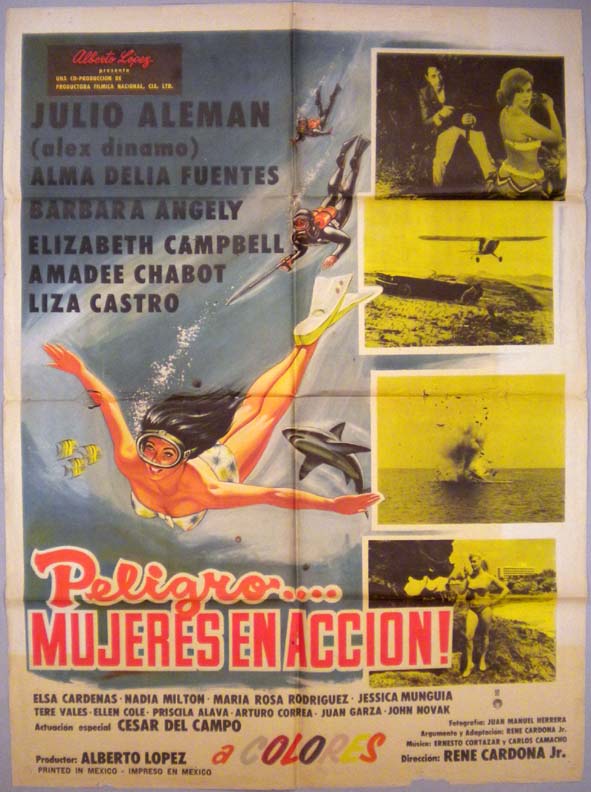 Colorful artwork highlights the poster from this 1967 Mexican comedy / spy film -- with a great image of a sexy woman scube diving. There are also several inset scenes from the film pictured. The poster has general signs of wear and usage, including: separation along the fold lines, edge wear, tears, border chips, holes and surface marks/dings. The flaws are not too distracting, and otherwise, the poster will display well... This movie starred Julio Aleman, Alma Delia Fuentes, Elizabeth Campbell, Barbara Angely and Amadee Chabot. $40 |