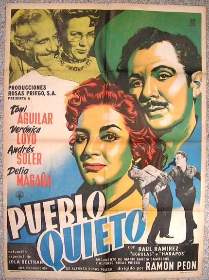 Attractive comedy film poster features great close-up images of the two leads -- Infante and Quintana. This onesheet has a great romantic image of a Mexican movie icon, Pedro Infante. The bottom horizontal fold line has reinforced on the back by a piece of masking tape, which has bled through a bit to the front -- but this flaw is not too distracting. Otherwise, the colors are clean and bright... This movie starred Pedro Infante, Rosita Quintana, Joaquin Pardave, Liliana Duran and Anita Blanch. $40 |