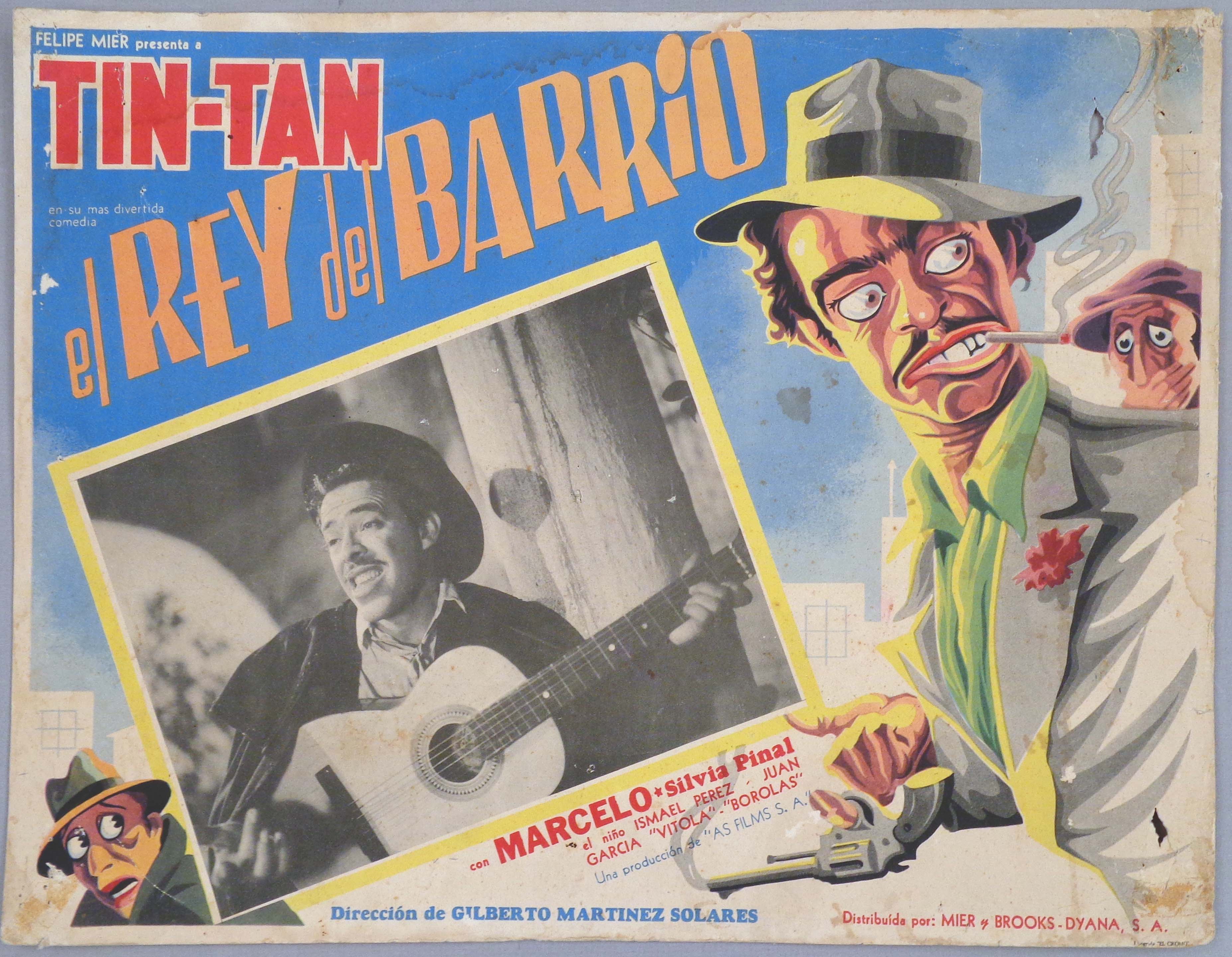 Great comedy film poster presents a colorful close-up portrait of comedian 'Tin Tan,' plus features an image of the two romantic leads talking on the telephone. This is a used poster that has some signs of handling-- separations at the fold lines, edge wear, small tears, and surface dings -- but the flaws are not very distracting and it will display quite well... This movie starred German 'Tin Tan' Valdes, Luz Maria Aguilar, Carlos Cores and Pancho Cordova. $30 |