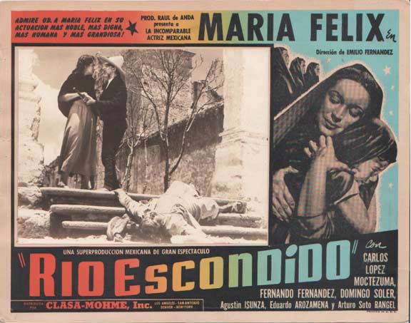 Classy Mexican award-winning film lobby card with a nice image of Ms. Felix in both the border art and in the B&W photo-scene. The card has signs of handling -- pinholes, corner bends, a repaired tear/crease above the lower right corner -- but these flaws are not very distracting... This movie starred Maria Felix, Carlos Lopez Moctezuma, Fernando Fernandez, Agustin Isunza and Domingo Soler. $20 |