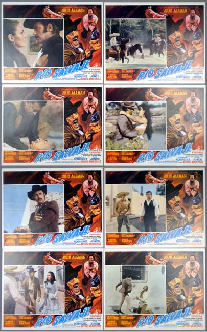Original set of 8 Mexican film lobby cards which feature colorful artwork and great glossy inset scenes picturing the main stars. You get all 8 cards for one low price! (Any glare visible in the photo was caused by a problem with our camera -- it is not a flaw on the cards themselves)... This movie starred Rodolfo de Anda, Angelica Maria, Jorge Russek and Rafael Baledon. $20 (for 8 cards) |