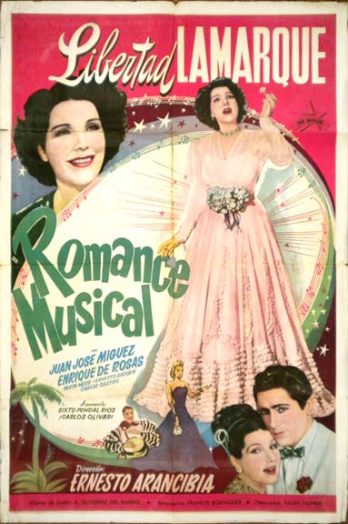 Colorful Argentine onesheet poster (29x43") from a Spanish-language musical film. The onesheet pictures a great image of Ms. Lamarque, plus an attractive montage of other scenes of the movie. There is wear and tears along the folds and edges, plus a hole at the center of the upper fold. However, the colors are bright and the poster would not be difficult to repair... The film starred Libertad Lamarque, Juan Jose Miguez, Carlos Castro and Bertha Moss. $30 |