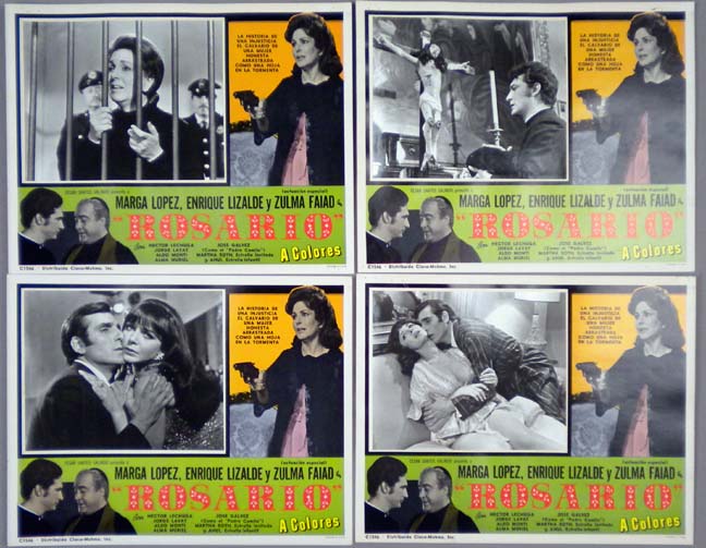 Colorful set of 4 Mexican film lobby cards which feature colorful artwork of popular star, Marga Lopez in the color art. The B&W photo-scenes feature great shots of sexy Zulma Faiad. You get all 4 cards for one low price! (Any glare visible in the photo was caused by a problem with our camera -- it is not a flaw on the cards themselves)... This movie also starred Enrique Lizalde, Aldo Monti, Zulma Faiad and Jose Galvez. $20 (for 4 cards) |