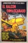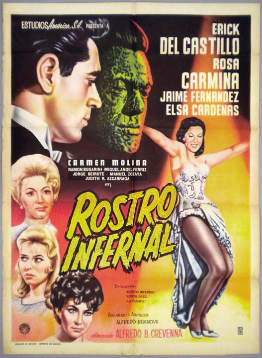 Colorful Mexican horror / sci-fi movie poster with lurid color and a nice portrait of the hideous monster. This was the first half of the two-film horror series, which concluded with, Huella Macabra. There is some edge wear, plus an area of discoloration caused by a piece of tape on the back, but these flaws are not too distracting. The poster will still display quite well... The film starred Eric del Castillo, Jaime Fernandez, Elsa Cardenas, Carman Molina and Ramon Bugarini. $30 |
