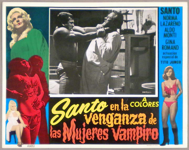 Lurid lucha libre / horror film lobby card features a vampire woman and some sexy women in the border art. Semi-sequel to, Santo vs. las Mujeres Vampiro.The card has a few light surface bends, but there are no major flaws... The film starred El Santo, Norma Lazareno, Gina Romand, Aldo Monti, Victor Junco and Frankenstein. $10 |
