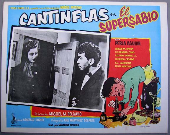 Colorful Cantinflas comedy film lobby card (11x14") pictures the comedian as a scientist in both the border art and in the black and white inset scene. Lobby cards come in sets of 8 different cards. The color artwork is the same on all cards from this film, but the small black and white is different on each card. The card currently available may have a different B&W scene than the one pictured... This movie starred Mario 'Cantinflas' Moreno, Perla Aguiar, Carlos Martinez Baena and Alejandro Cobo. $20 each |