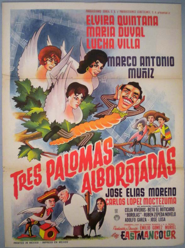 Colorful Mexican musical comedy film poster features wonderful caricatures of the four main stars -- with the three woman portrayed as hungry birds, and Muniz appearing as the worm they are chasing. The poster has some wear and repairs along the bottom fold, but this flaw is not very distracting. Otheriwse, the colors are bright and it will display well!... This movie starred Elvira Quintana, Maria Duval, Lucha Villa, Marco Antonio Muniz, Carlos Lopez Moctezuma and Jose Elias Moreno. (This poster has only limited, very mild fold lines -- so it will be sent rolled.) $30 |