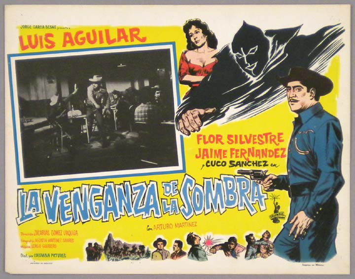 Attractive masked hero / western film lobby card (11x14") features a nice image of the star, Luis Aguilar, plus a great portrait of the hero he portrays -- La Sombra Vengadora. Average signs of use -- pinholes and mild soiling -- but no major flaws... The film starred Flor Silvestre, Jaime Fernandez, Cuco Sanchez, Arturo Martinez and Fernando Oses. $10 each |