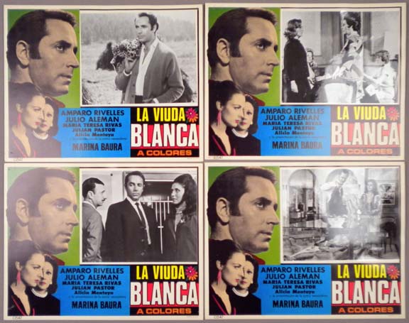 Colorful set of 4 Mexican film lobby cards which feature colorful artwork and great glossy inset scenes picturing the main stars. You get all 4 cards for one low price! (Any glare visible in the photo was caused by a problem with our camera -- it is not a flaw on the cards themselves)... This movie starred Amparo Rivelles, Julio Aleman, Julian Pastor, Marina Baura and Maria Teresa Rivas. $20 (for 4 cards) |