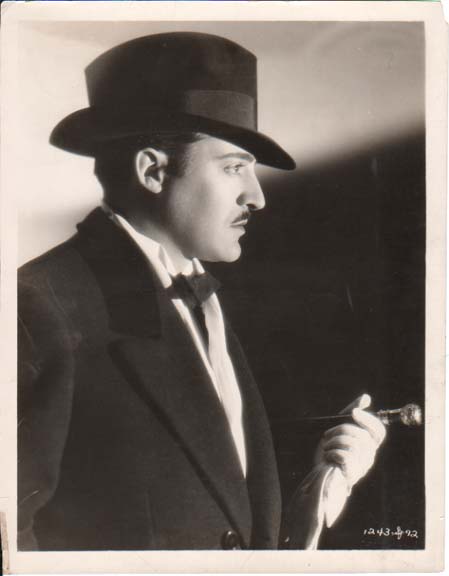 Original B&W still from a 1930 Mexican detective film. Superb portrait of Ramon Pereda. The photo has a few light bends/dings -- but no major flaws... This movie starred Ramon Pereda, Antonio Moreno, Andres de Segurola, Barry Norton and Maria Alba. This early 'Philo Vance' mystery film was a Spanish language version of The Benson Murder Case. Film information is printed -- in Spanish -- on the back. $35 |