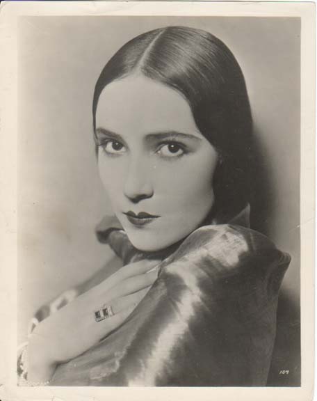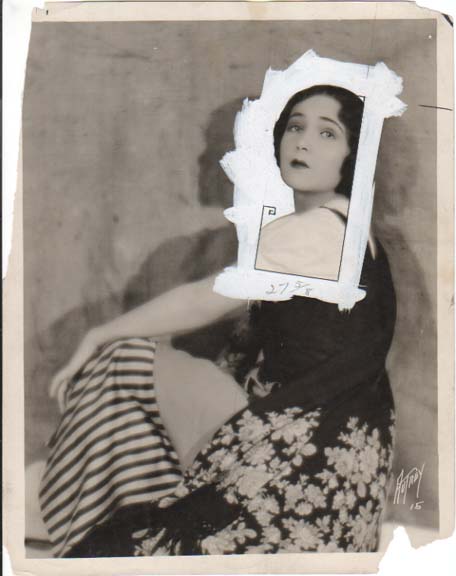 Original 1920s studio portrait of Dolores del Rio. This photo was apparently used as an illustration for a newspaper, or magazine. The left background section has been trimmed. There are also some publisher's cropping marks -- including quite a bit of hand-painted embellishments/highlights surrounding Ms. del Rio -- so that the actress would stand out more clearly. There are a few other notations, handwritten on the reverse side of the photo, in addition to an original info snipe. The original date was Oct. 30, 1928. $25 |