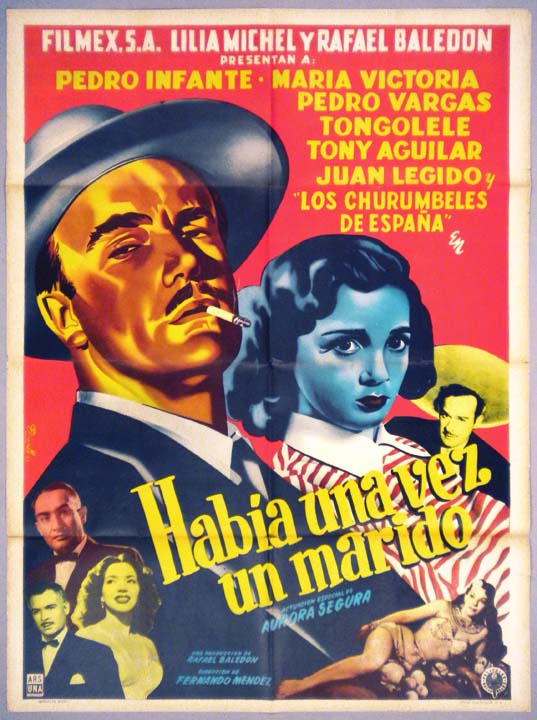 Beautiful Mexican musical movie poster -- with a film noirish slant -- features great images of the two stars -- a tough looking Infante is smoking a cigarette. There are a few repaired tears, but they are clean with no paper loss -- so they are almost invisible. The poster looks superb, with great color and style!!!... The film starred Pedro Infante, Maria Victoria, Pedro Vargas, Antonio Aguilar and Tongolele. Sold |