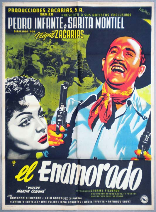 Striking Mexican western / comedy movie poster, by Renau, features a colorful image of Pedro Infante contrasted with a black and white rendition of Sara Montiel... The film starred Pedro Infante, Sara Montiel, Eulalio 'Piporro' Gonzalez and Armando Silvestre. Sold |