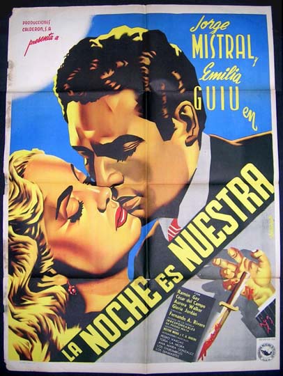 Elegant Mexican romance movie poster features a wonderful close-up image of Mistral and Guiu. There is also a film noirish hand with a bloody knife near the lower left corner. The poster has some wear along the left side border, but this does not affect the lovely image area. Also, in the past, someone reinforced the center of the bottom horizontal fold line on the back with tape, and the tape has discolored a small section of the poster a bit. This flaw is slightly visible on the front, but it is not very distracting. Otherwise, the colors are bright and the poster will still display beautifully... The film starred Jorge Mistral, Emilia Guiu, Ramon Gay, Cesar del Campo and Aurora Walker. Sold |
