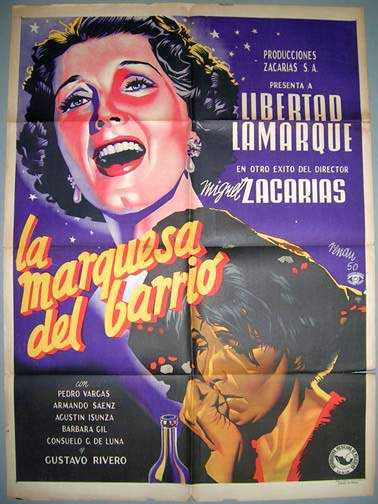 Attractive musical film poster with a dramatic image of the popular actress, Libertad Lamarque. Great Renau style and vivid coloring! There has been some minor repair along the fold lines, but this slight restoration was well done and is not very noticeable. The poster will display beautifully!... This movie starred Pedro Vargas, Armando Saenz, Agustin Isunza, Barbara Gil and Gustavo Rivero. $95 $65